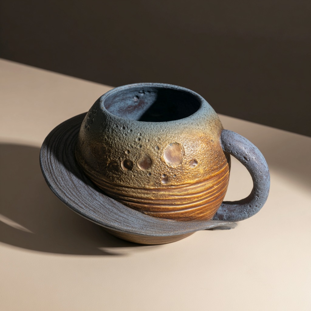 • Saturn Mug: Distinctive ring handle design with golden accents