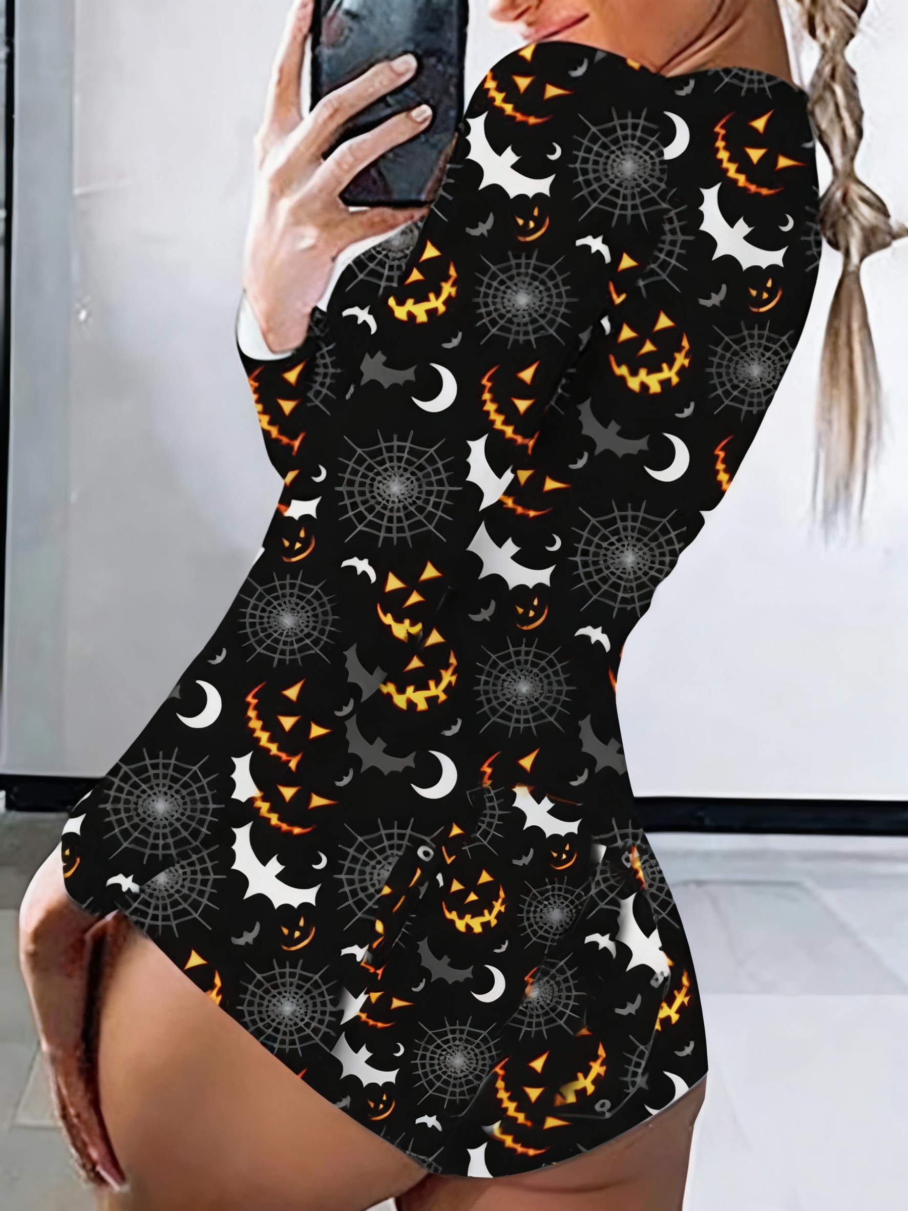 Halloween Print Long Sleeve Sexy V-Neck Button Bodysuit