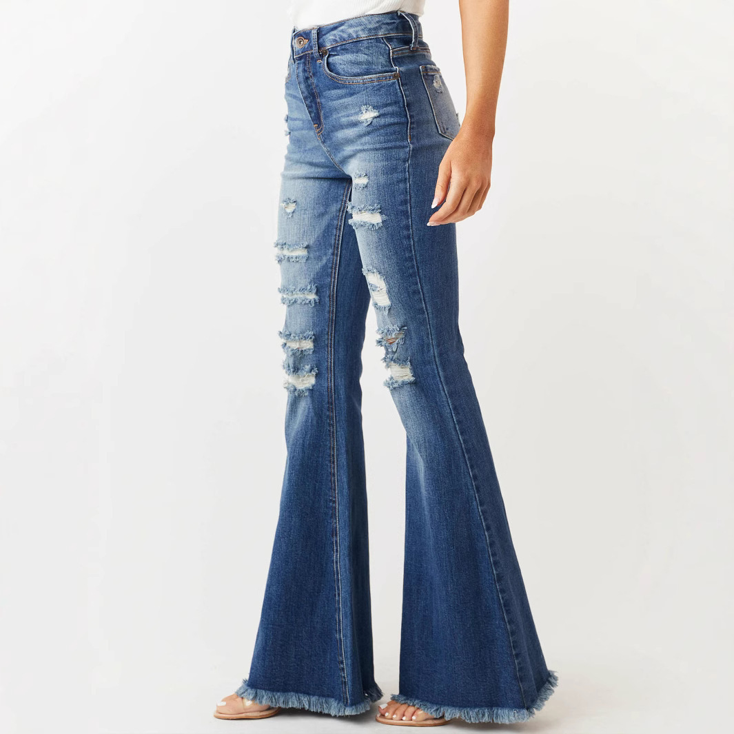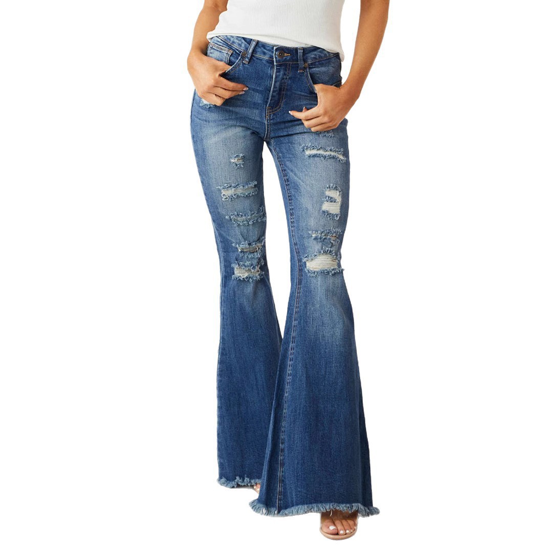 Women's Fall Winter Vintage High-Waisted Distressed Fringe Flare Jeans